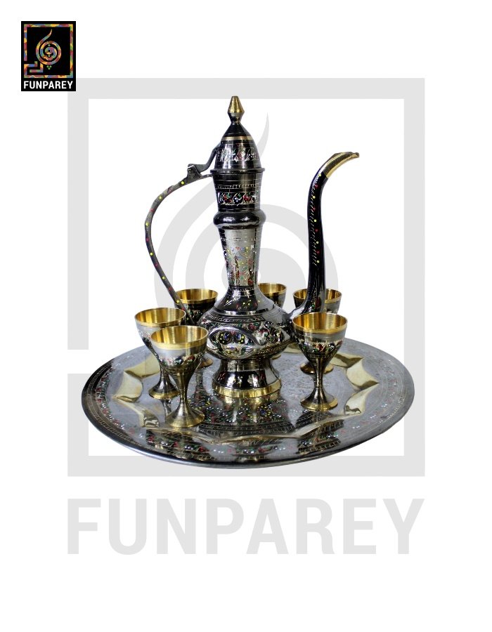 - This is a Set Product, comes with one Pitcher (Aftaba/Oftoba), 6 Chalices/Glasses and a Round Brass Tray (not shown in the picture).
