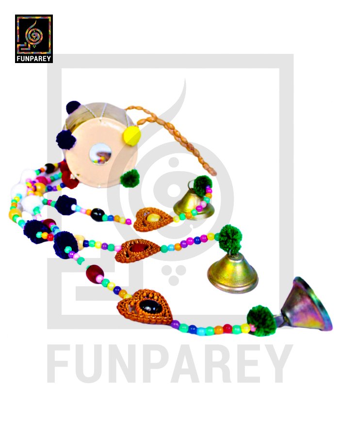 - Includes plastic beads, rexine leather, and brass trinkets.
