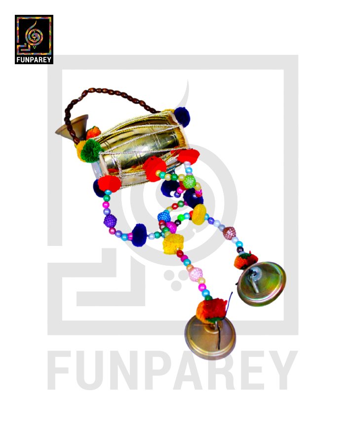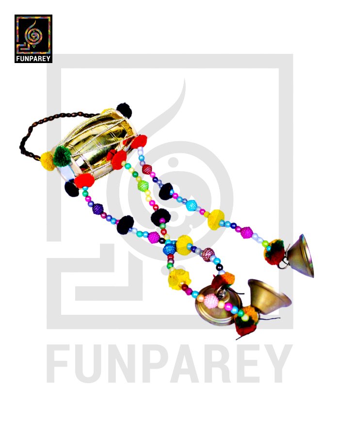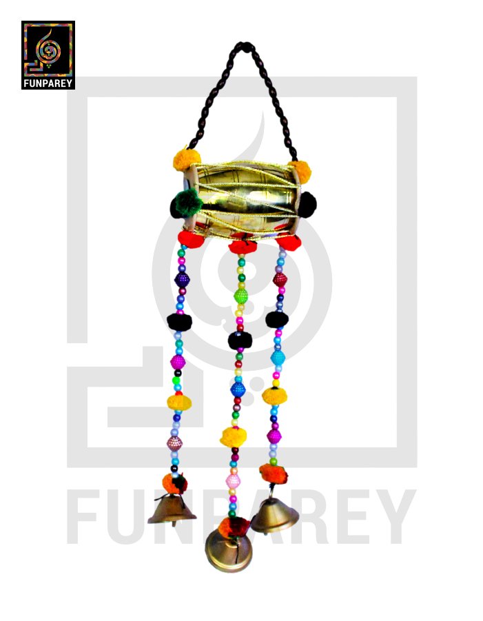 - Each Door Chime has a Whole Brass Drum / Dhol and also uses a combination of other materials such as Embroidered Fittings of fabric, Plastic Beads, Rexine leather, as well as Brass trinkets in its making.