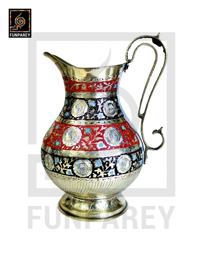 - The Brass jug and Glasses are neatly decorated with colored Motif designs.