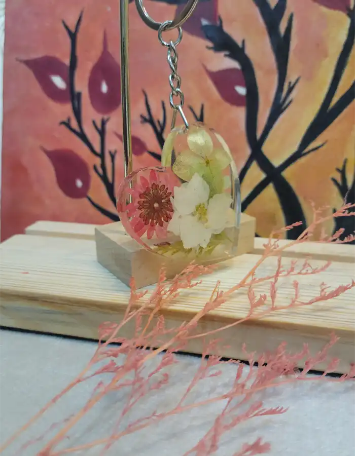 - Floral Arrangement: Showcases white, green, and red wild pressed flowers encapsulated in resin.