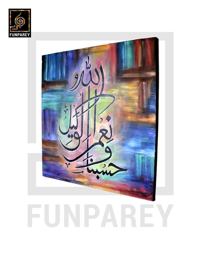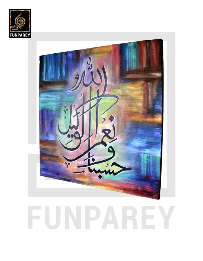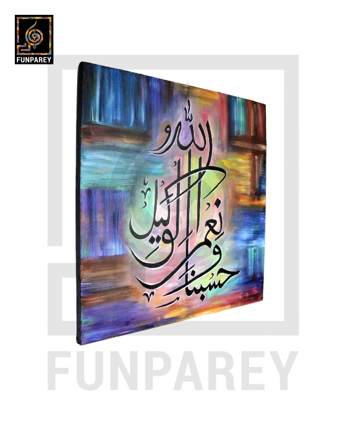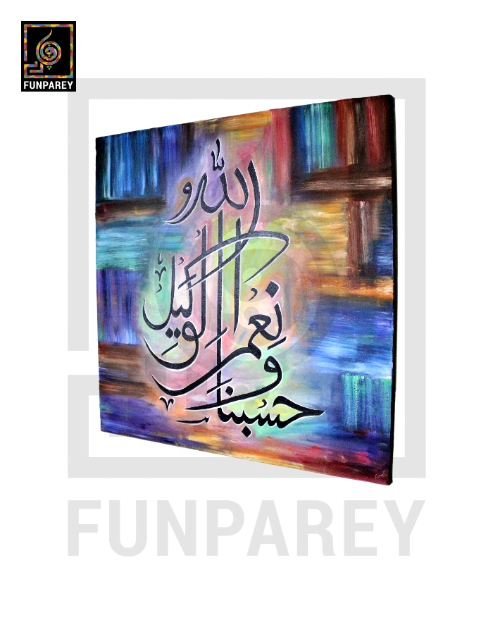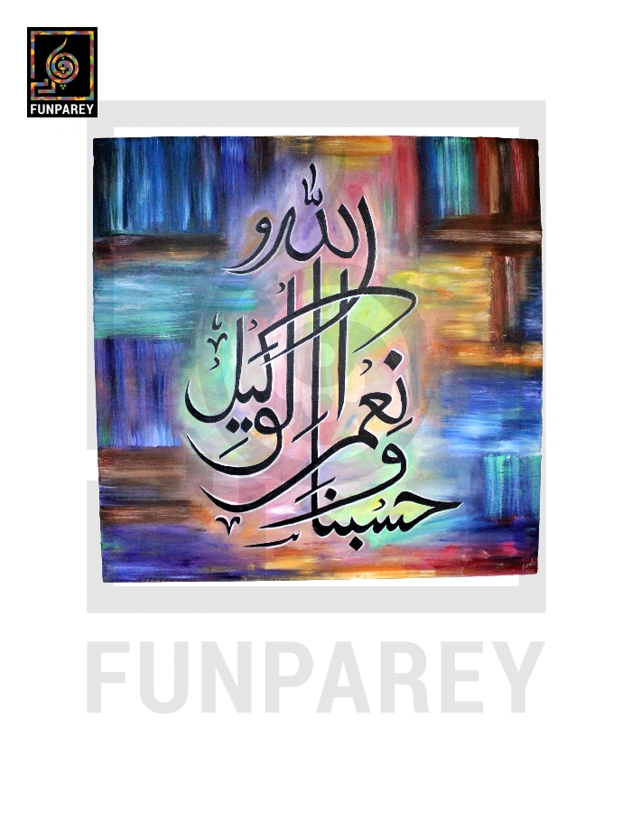 - The Islamic calligraphy on the colorful abstract are Verses in Quran from Surah Āl-‘Imrān, Ayah: 173 (Arabic: حسبنا الله ونعم الوكيل Urdu: ہمیں اللہ کافی ہے اور وه بہت اچھا کارساز ہے) which means: “Allah