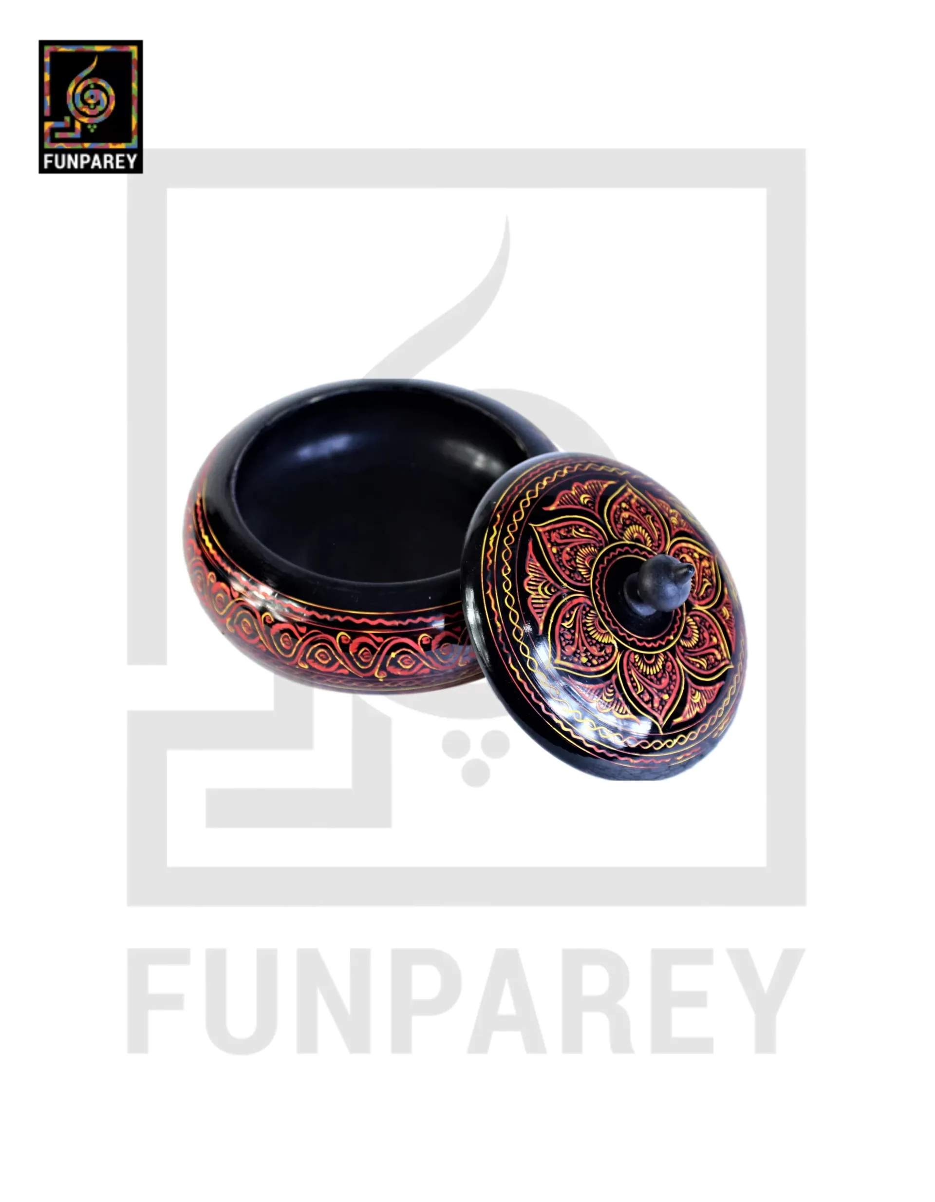 - Wooden Candy Bowl or Powder Box with Lacquer Art has a belly diameter of 6 Inches.