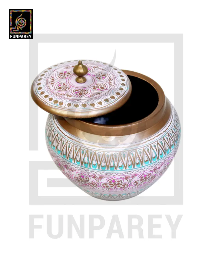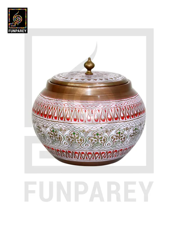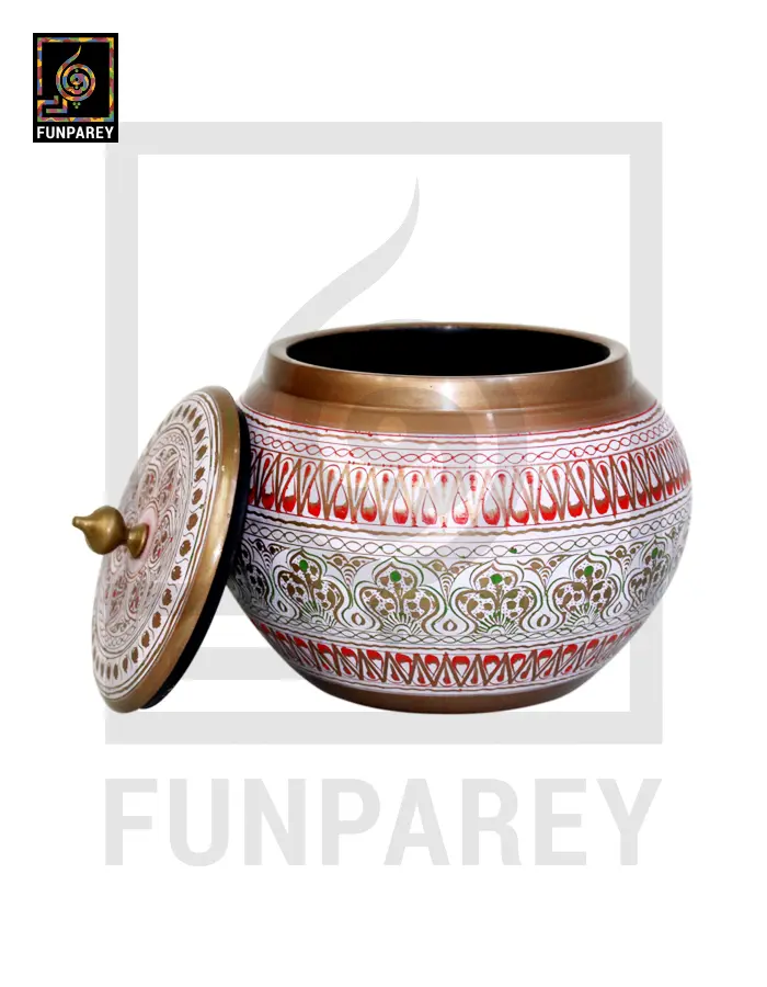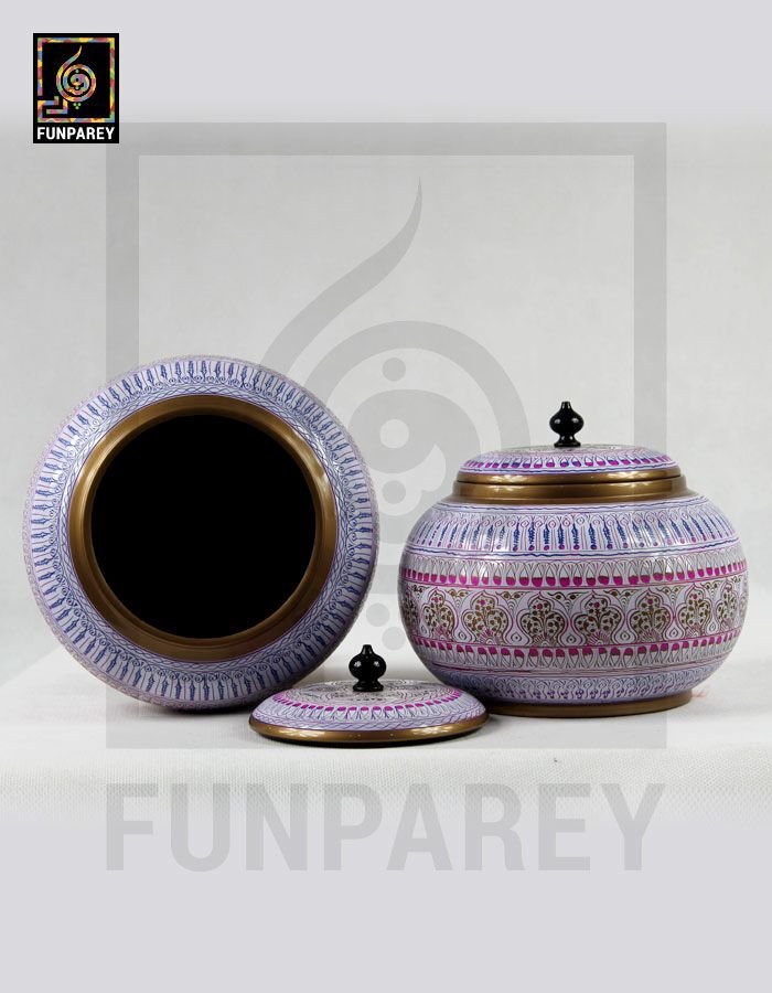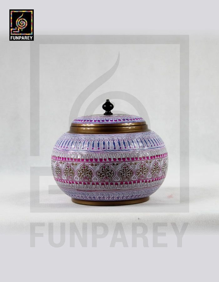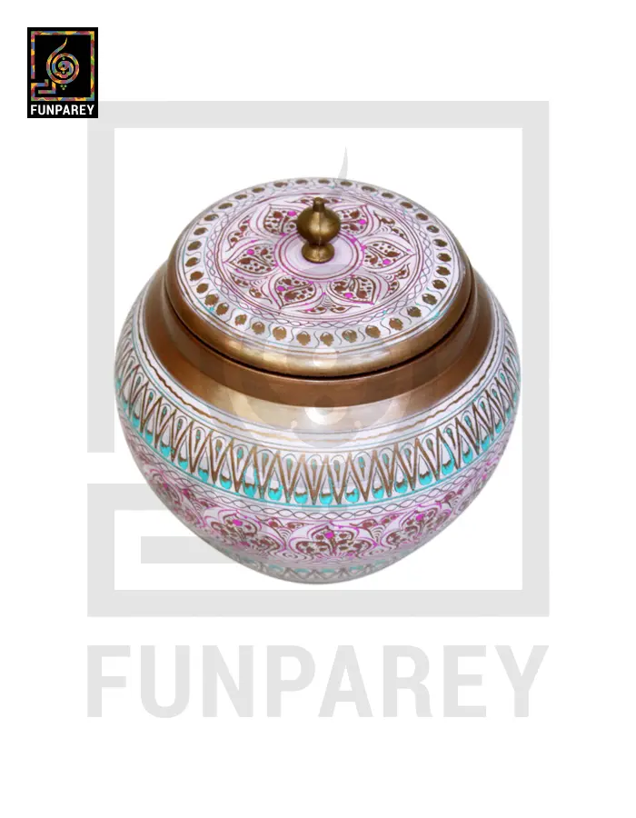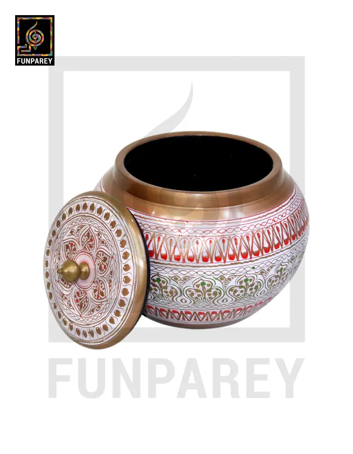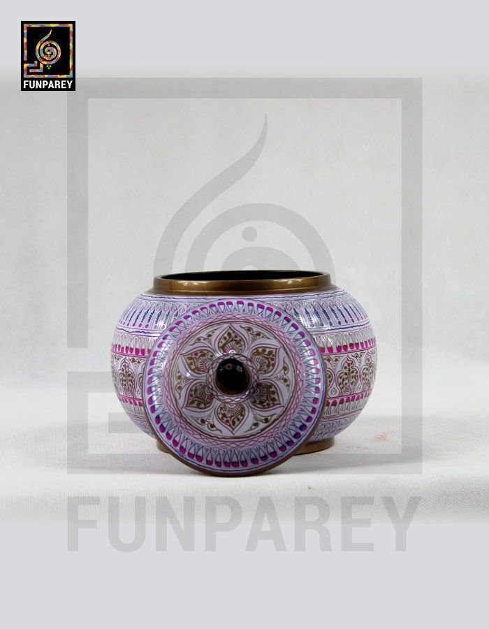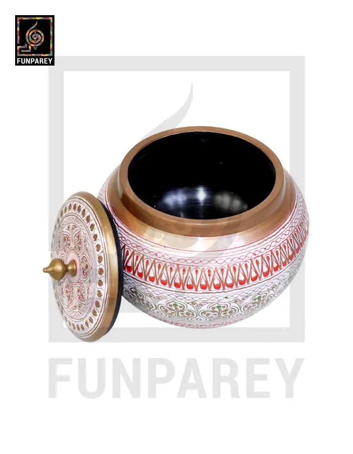 - Wooden Cauldron Pot with white Lacquer Art has a belly diameter of 6.5 inches approx and the height is 6.5 Inches approx.